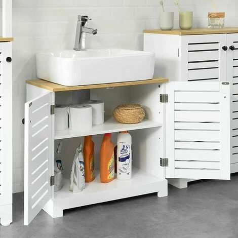 - 2 Fächer hinter den Türen, Handtücher, Toilettenpapier und andere Badutensilien darin werden vor Staub, Wasser und ungewollten Blicken geschützt; höhenverstellbarer Einlegeboden