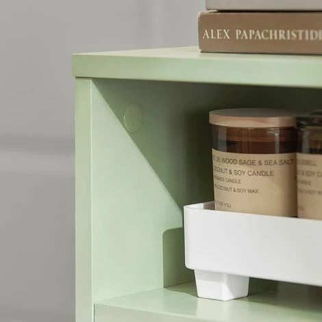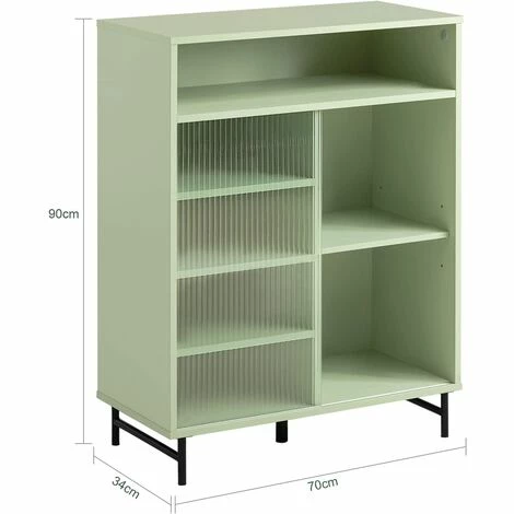 Die grünen MDF-Platten und das Glas sorgen für einen eleganten und modernen Look. Ohne Schubladen und Türgriffe macht er einen aufgeräumten Eindruck. Mit der schönen Optik zieht dieser Schrank ob in der Diele, im Wohn- oder im Schlafzimmer alle Blicke auf sich.