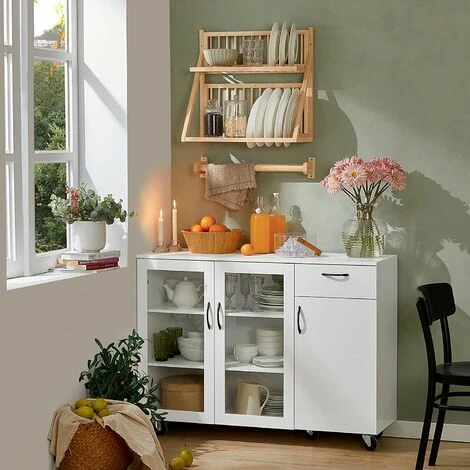 Um Ihre Teller an Ort und Stelle zu halten, hat der Schrank Halterungen für 22 Teller. In den Ablagen können Sie auch Tassen, Gewürzdosen usw. aufbewahren.