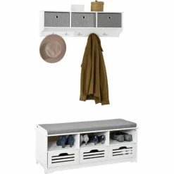 - Wandgarderobe: Die 3 entnehmbaren und faltbaren Vliesboxen bieten genügend Platz für Schlüssel, Briefe uvm. Die schicke Garderobenleiste hat 5 Metallhaken für Jacken, Mäntel, Handtaschen uvm. im Flur.